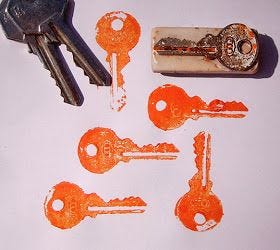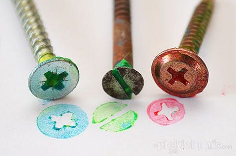 Clockwise from top left: Ice tray stamp, wine bottle stamp and popsicle stick stamp by papernstitchblog.com, key stamp by scrap-tea.blogspot.com, screw stamps by picklebums.com, and button stamps by favecrafts.com
