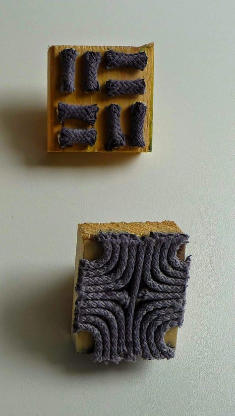 From left: rubber band stamp (www.urzadzamy.pl), string stamp (elizabethjoandesigns.com), and rope stamps (www.sewsewart.com) Found Object Stamps: There is pretty much no limit to what you can use to make a stamped pattern from. Think bubble wrap, bottles, bottle tops, keys, buttons, popsicle sticks, ice trays, batteries, nails, paperclips, q-tips, forks, corks, you name it!