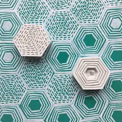 Lino cut stamps by designer Jeanne McGee (printpattern.blogspot.com/2018/06/designer-jeanne-mcgee.html) Fruit & Veggie Stamps: I think we all know how to make a potato stamp, but let’s run wild with the fruit and vege bin! You might be amazed and what patterns you can create when you slice through an apple, a celery stalk, a mushroom, or a cabbage. Nature is the true master of pattern making.